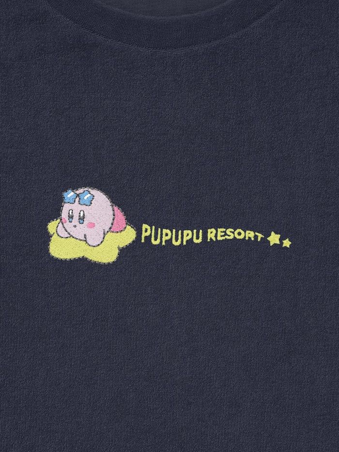 胸元にはワープスターに乗ったカービィ。パンツのヤシの木の刺繍もポイント。