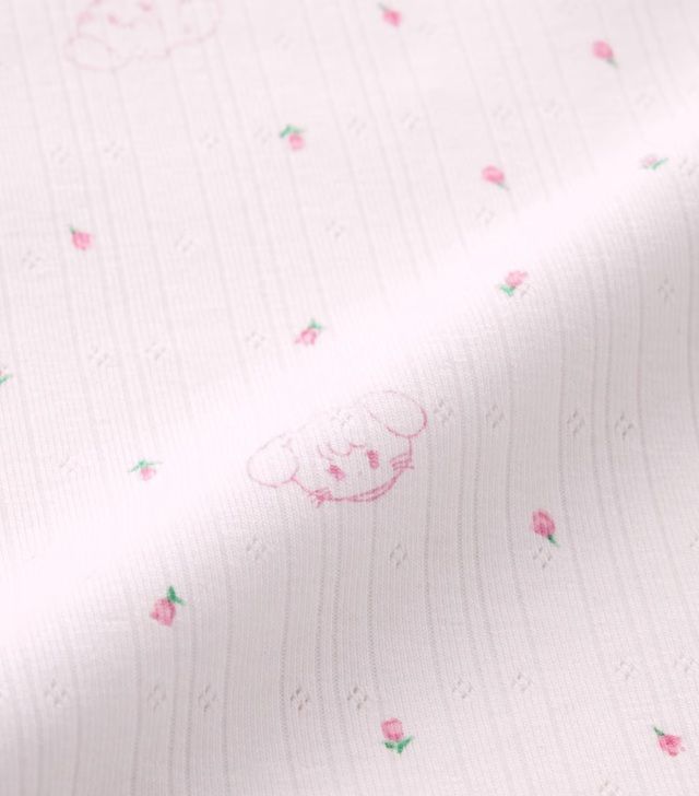 ポジティブで社交的な子うさぎのキャミ―とかわいい花の総柄デザイン。