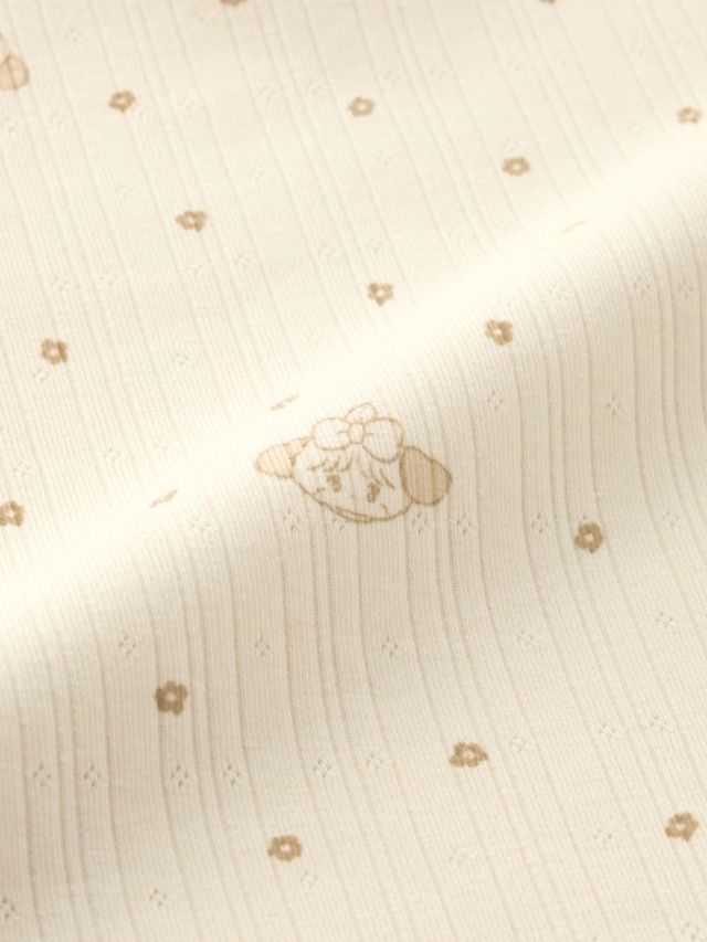 マイペースで甘えん坊な子いぬのスフレとかわいい花の総柄デザイン。