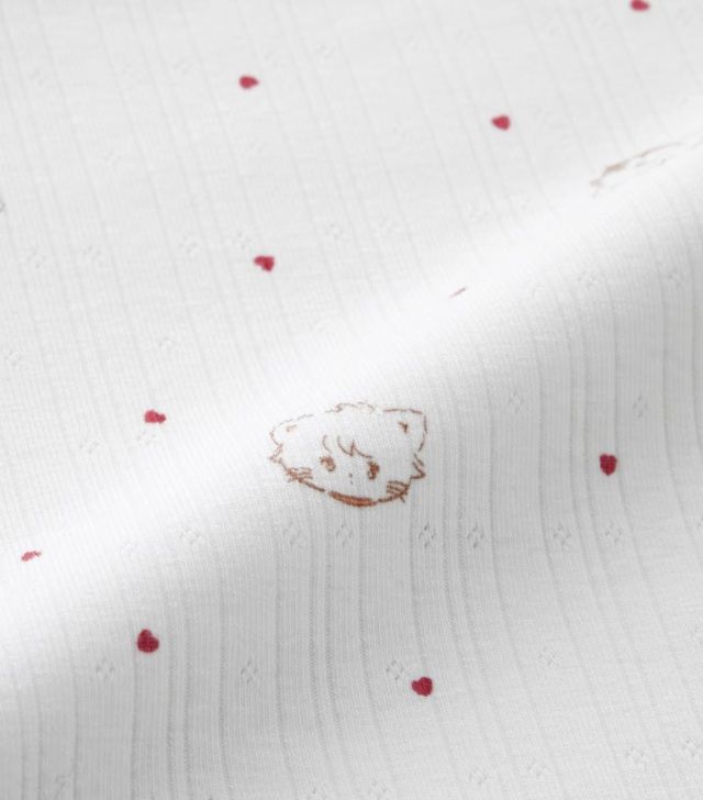 恥ずかしがり屋の子ねこ、ムースとハートの総柄デザイン。