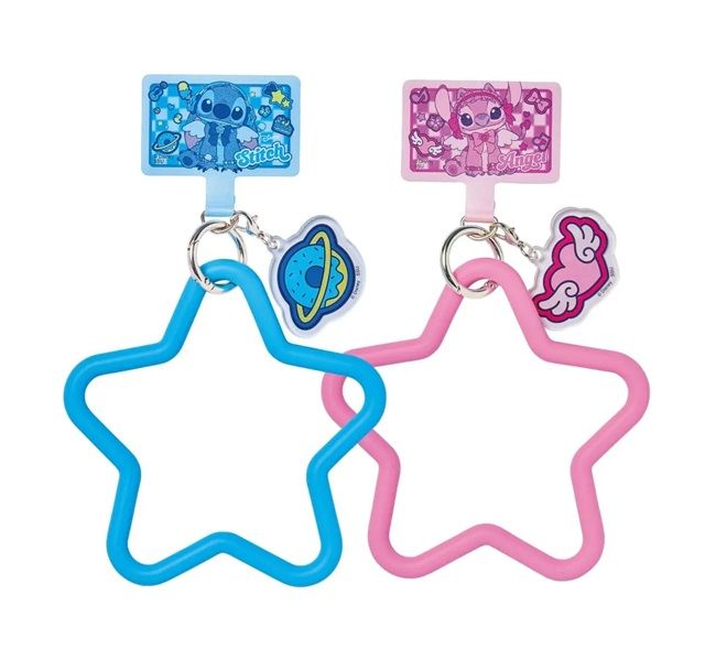 描き起こしアートのスティッチとエンジェルをデザインした、星形ストラップ&アクリルチャーム付きのスマホハンドストラップ!