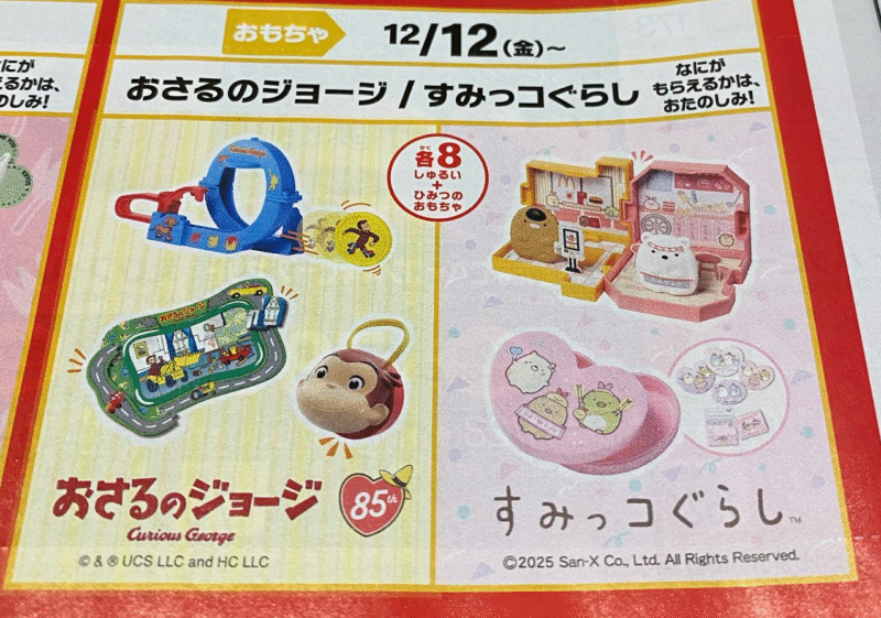 マクドナルドでは、2025年12月12日(金)~『すみっコぐらし』のハッピーセットを販売します!おもちゃは全9種類で、今回はシークレット(ひみつのおもちゃ)も1種類含みます!