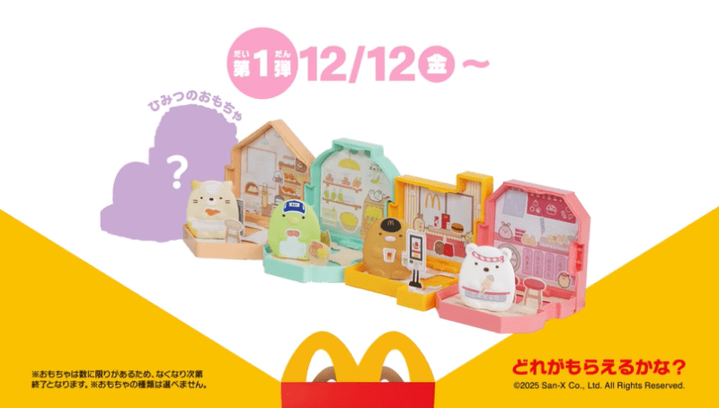 マクドナルドでは、2025年12月12日(金)~『すみっコぐらし』のハッピーセットを販売します!おもちゃは全9種類で、今回はシークレット(ひみつのおもちゃ)も1種類含みます!