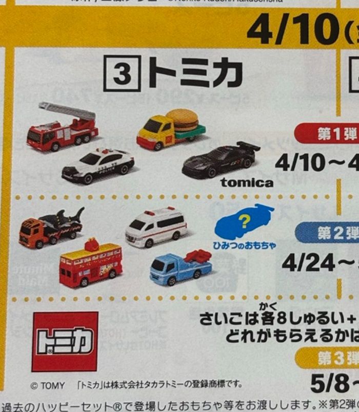 トミカ!マックのハッピーセット2026年4月おもちゃが登場!全9種類でシークレット(ひみつのおもちゃ)も!種類、口コミ、識別番号まとめ!