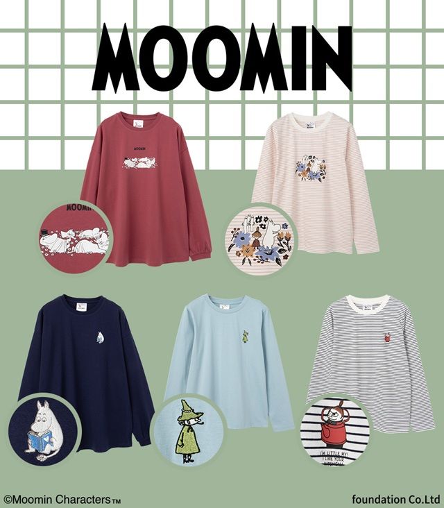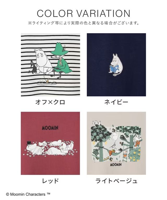 ムーミンと仲間たちのプリントや刺繍がおしゃれなデザイン。