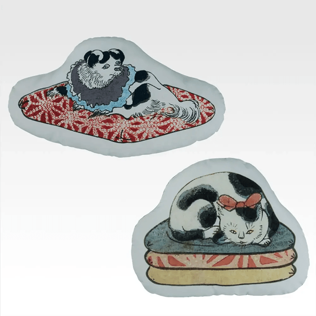 座布団にちょこんと座る狆(ちん)と、猫。普段使いしやすいクッションになりました。
