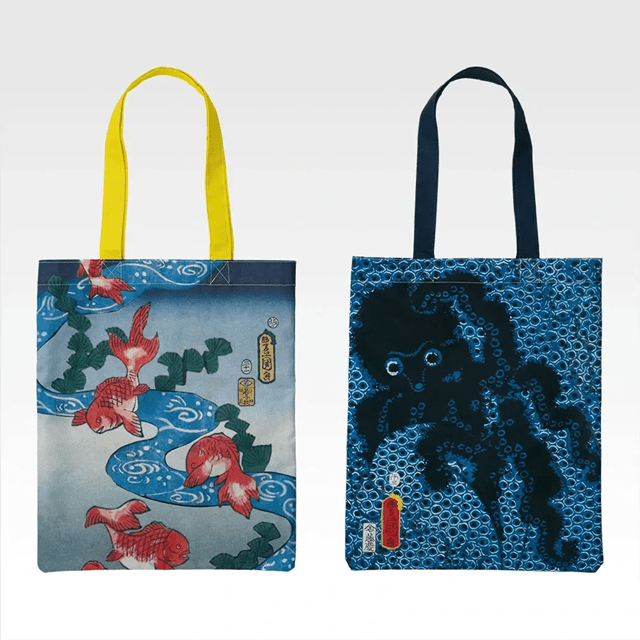 歌川豊国の「江戸名所百人美女」より、「東本願寺」と「薬研堀」の美女着用の着物柄をトートバッグにリデザインしました。