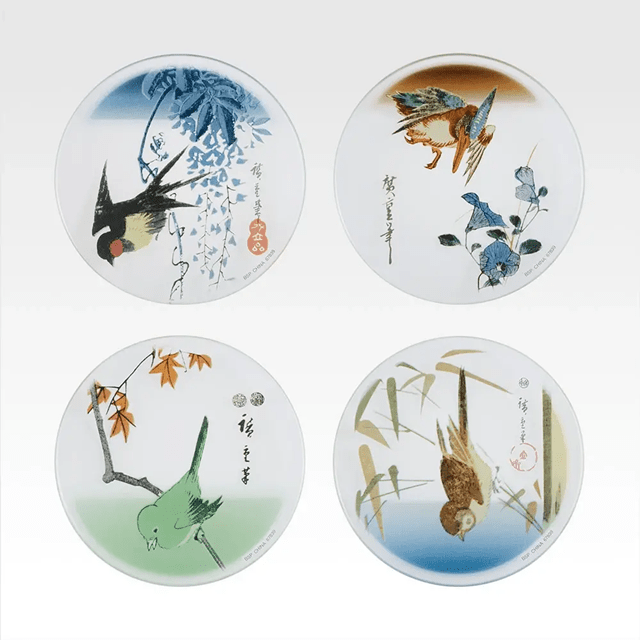 歌川広重の描く「花鳥図」より、愛らしい鳥と可憐な花がガラスの小皿になりました。