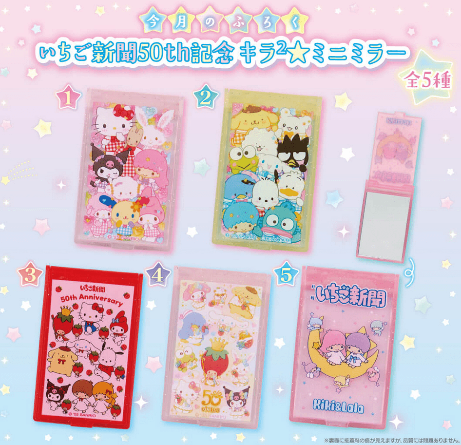 ふろくは、小さなバッグやポーチにぴったり入る「いちご新聞50th記念 キラ2☆ミニミラー」全5種☆
