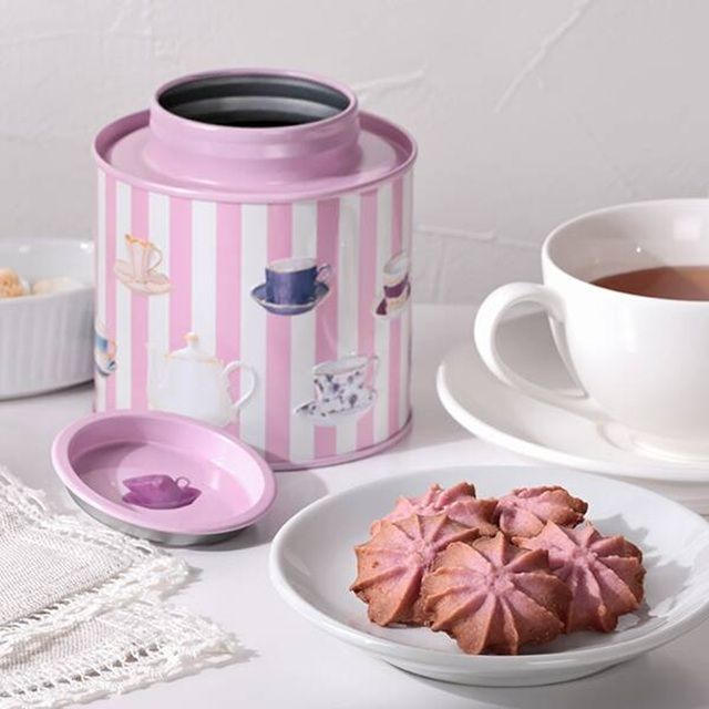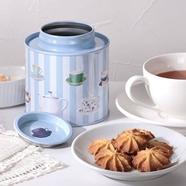 キャニスター缶に紅茶味のクッキーを詰めました。缶の側面の絵柄はエンボス加工がされています。お菓子を食べたあとは保存容器にも。