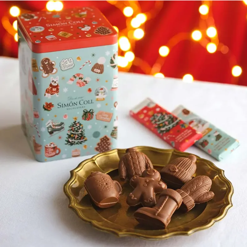 華やかなクリスマスデザインの缶の中に、スペイン産の口どけなめらかな手袋やセーターの形のミルクチョコレートと、チョコレートバーが入っています。