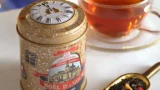 鮮やかなミントグリーンの缶に、ヴィクトリアン調のロゴを鮮やかな金色のエンボス加工で描いた紅茶缶。
