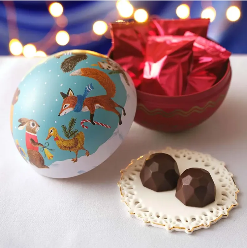 おめかしした女の子と男の子がチョコレートを分け合うほほえましいクリスマスのワンシーンがデザインされた蝶番缶。カファレルの代名詞であるジャンドゥーヤや人気のピエモンテに加え、抹茶フレーバージャンドゥーヤのリス、サンタクロースやきのこ、テントウムシのホイルチョコレート、ユーロコイン型チョコレートなど全13粒のチョコレートがアソートされています。