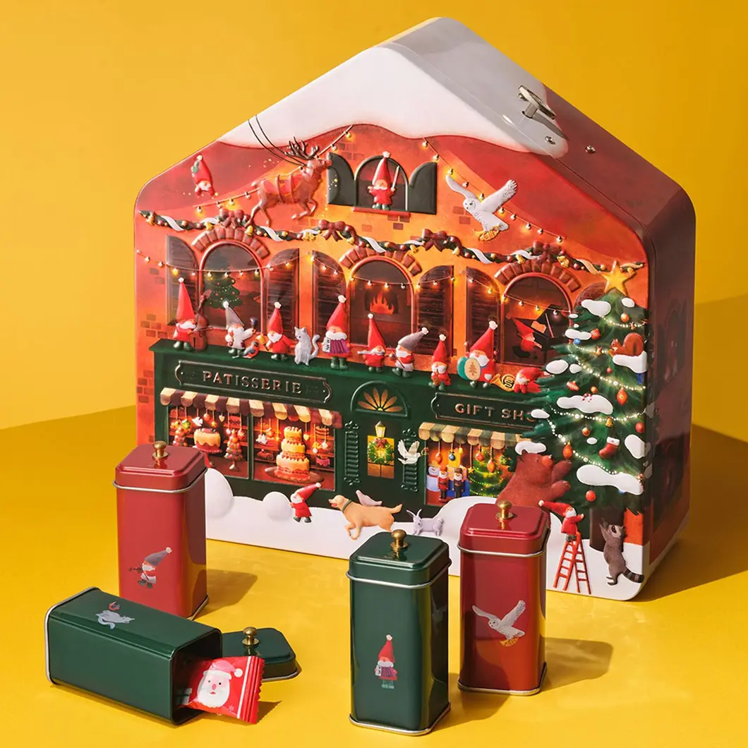 屋根についた巻きネジを回すとクリスマスソングが流れる、おうちの形をしたアドベントカレンダーです。ずらりと並んだ小さなキャニスター缶の中に、キャンディやチョコレートなど2種のお菓子が計24個入っています。