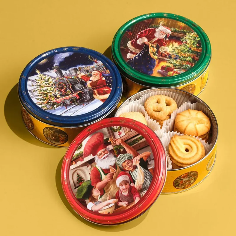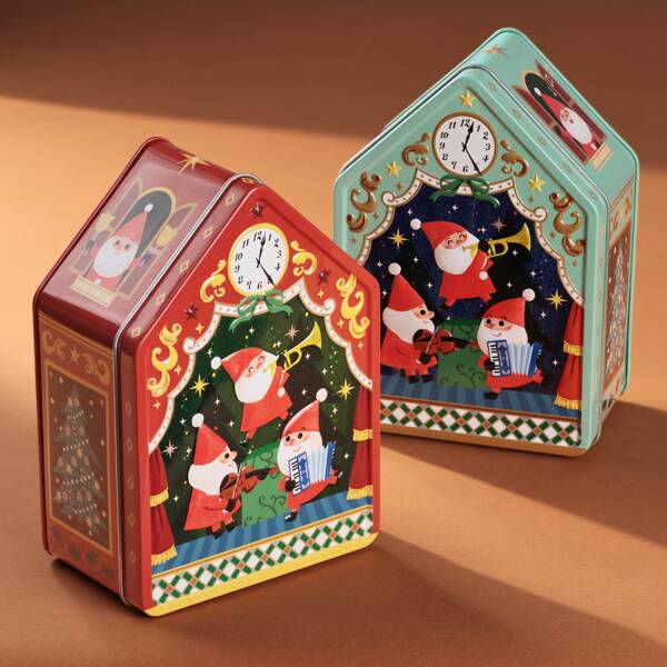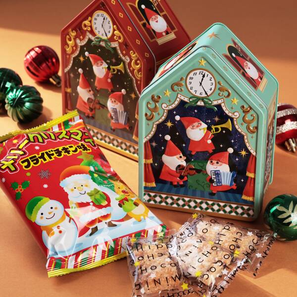 サンタとツリーのイラストがかわいいデザイン缶にお菓子が入っています。フタのイラストはエンボス加工されています。外装カラーは2種類!