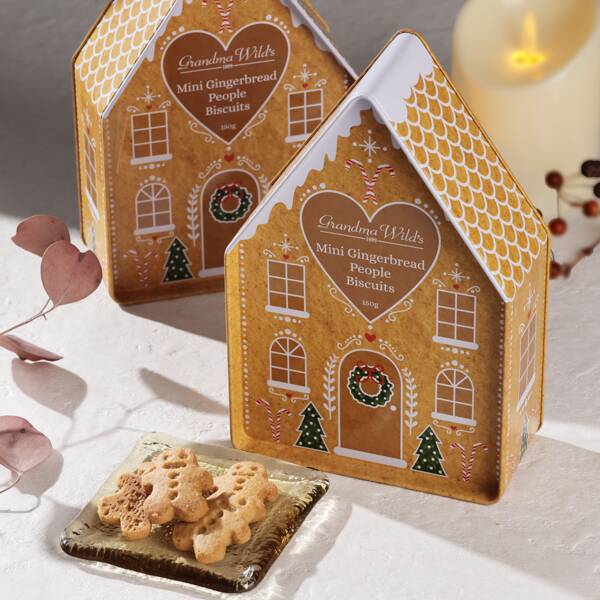 イギリスの伝統的なレシピに基づいて焼かれたクッキーです。ジンジャーブレッドハウスのデザイン缶の中にジンジャーブレッドビスケットが入っています。