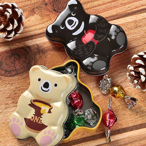 かわいいベアが描かれたデザイン缶にボールチョコレートが入っています。缶の色は2種類!