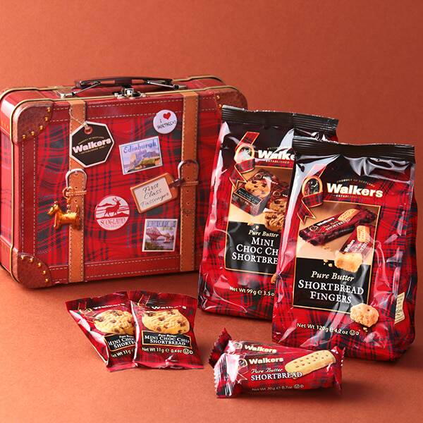 赤いタータンチェック柄のパッケージで有名なウォーカー(Walkers)のショートブレッドです。スーツケース型の缶に、ミニショートブレッド2種類の詰め合わせが入っています。