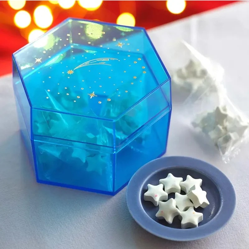 キラキラと光る星空がデザインされた透明な小箱に、星の形のラムネを詰め込みました。※容器には製造工程で生じる細かな線や白い傷のような跡が必ずあります。