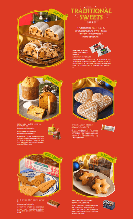 ドイツ発祥の焼き菓子「シュトーレン」や、イタリアの伝統的な菓子パン「パネトーネ」など、海外のクリスマス気分が満喫できる伝統菓子を取り揃えます。