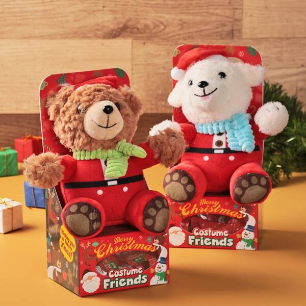 クリスマスコスチュームを身にまとったベアとイヌのぬいぐるみ。ボックスの中にアップルキャンディが約7個入っています。ぬいぐるみは2種類!