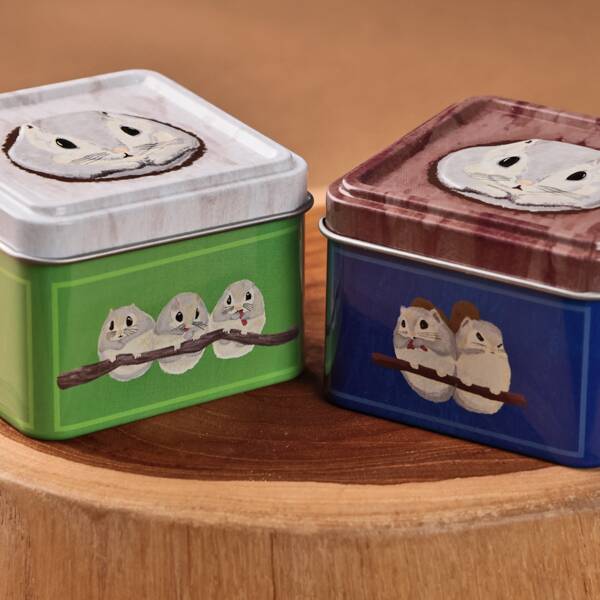 エゾモモンガのイラスト入りの缶にチョコクランチ2個をいれました。缶のデザインは2種類、いずれかおひとつお届けします。