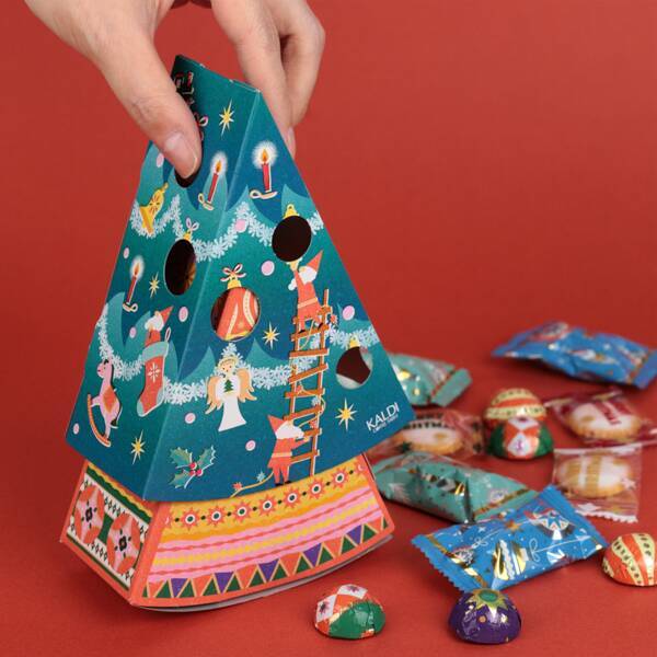 お菓子が入ったツリーのかたちのペーパーボックスです。箱を立てるとゆらゆらと揺れるツリーになります箱の底部は傾斜が付いているので、立てて飾るとゆらゆらと揺れます。箱の中には半球型のチョコ6個、クランチチョコ4個、アイシングクラッカー3個が入っています(個包装)。ディスプレイにもかわいいサイズです。
