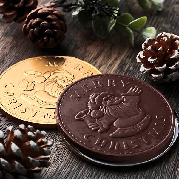 まるでコインのようなかたちの手のひらサイズのミルクチョコレートです。ベルを手にもったサンタが型押しされています。直径約78mmの大きめサイズ!