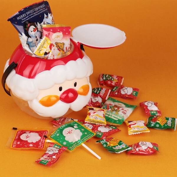 ぷっくりと立体的な中身が見えるサンタバケツです。なかにロリーポップキャンディやクッキー、ポップコーンを約21個詰め合わせました。