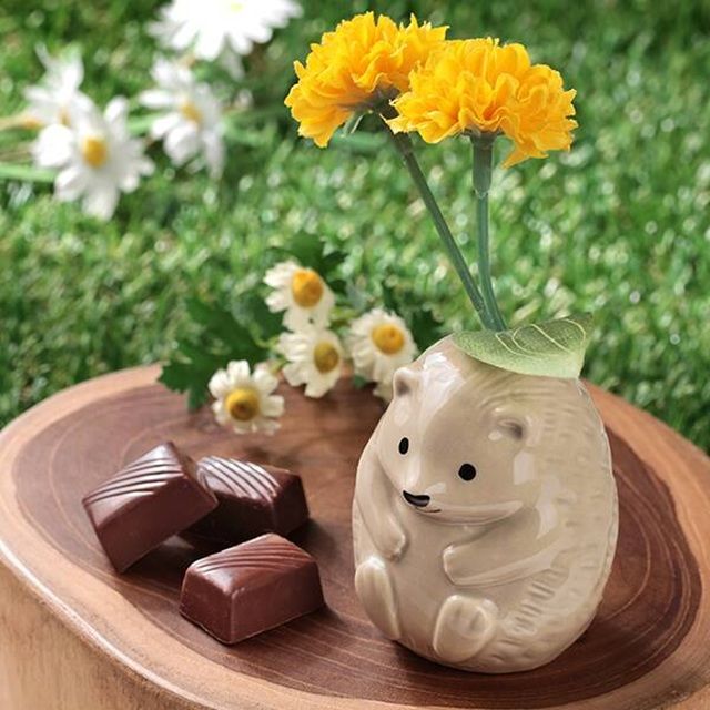 ハリネズミのフラワーベース(一輪挿し)です。アーモンドチョコレート3個付き。