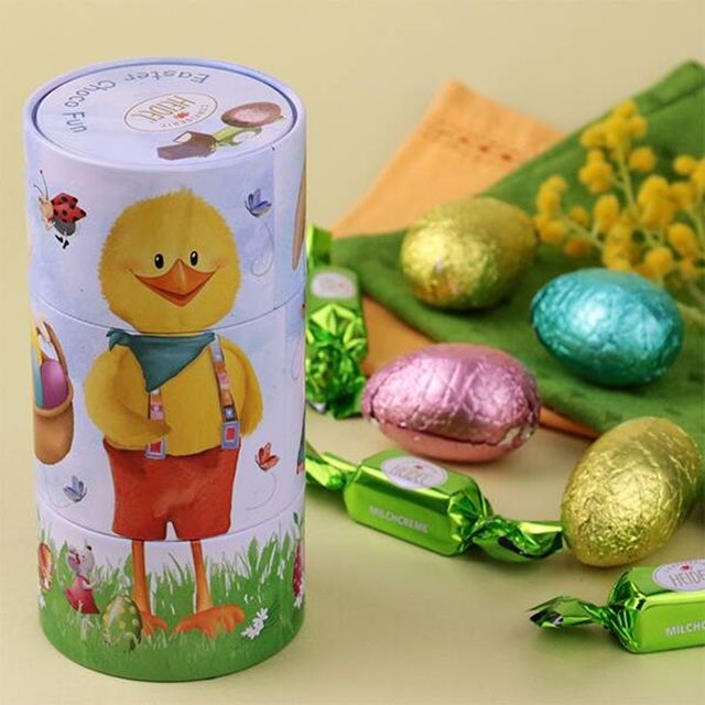 筒型の缶の中にたまごのかたちのミルクチョコとミルククリームチョコが入っています。缶を横に回していくと、うさぎ、ひよこ、ひつじの3柄の絵合わせで遊ぶことができます。