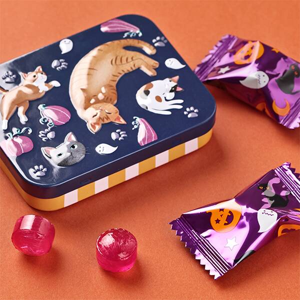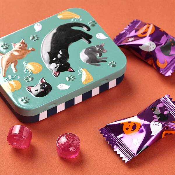 ハロウィンをモチーフにしたネコのスクエア缶にキャンディを詰めました。食べ終わったあとは小物入れとしてお使いいただけます。