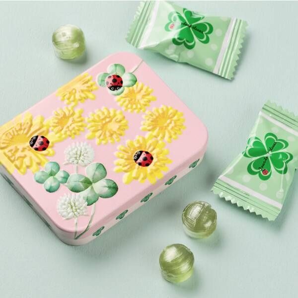 ヨーロッパで幸運をもたらすとして親しまれているてんとう虫をデザインした缶に、青りんご風味のキャンディが入っています。お菓子を食べ終わったあとは小物入れにも。