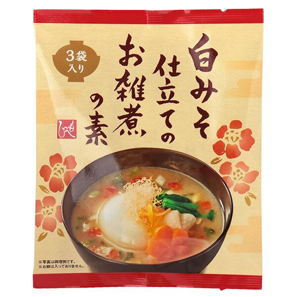 かつお風味を利かせた「白みそ仕立てのお雑煮の素」です。白ねぎ、にんじん、柚子、三つ葉の4種の具材入り。湯を注ぎ、お餅を入れればお雑煮が出来上がります。