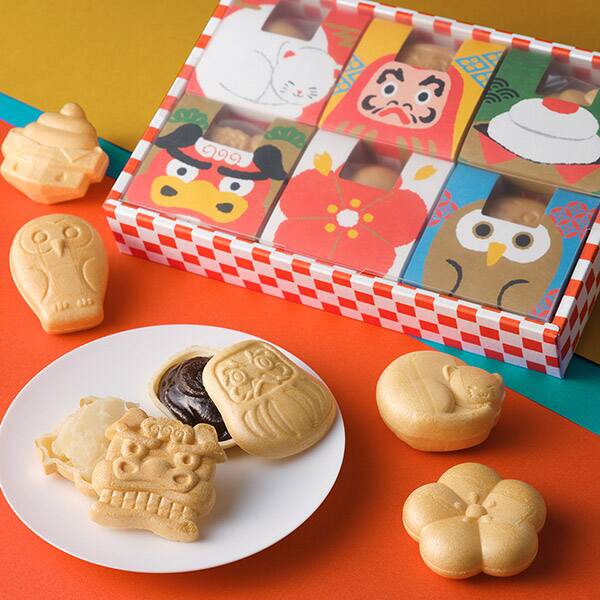 縁起物「だるま」「ふくろう」「ねむり猫」「獅子舞」「鏡餅」「梅の花」の形がかわいい、手作り最中です。猫・だるま・鏡餅にはこしあん、ふくろう・梅の花・獅子舞には白あんがセットになっています。