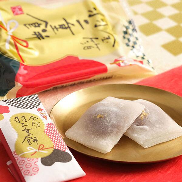 口の中でほんのりととろける絹のように滑らかな食感の羽二重餅につぶあんを包み込み、上品に金箔を添えました。