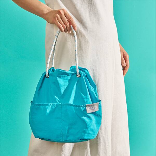 軽さが特徴のナイロン素材のバッグ。ロープを絞ると、ころっとしたかわいいフォルムになります♪