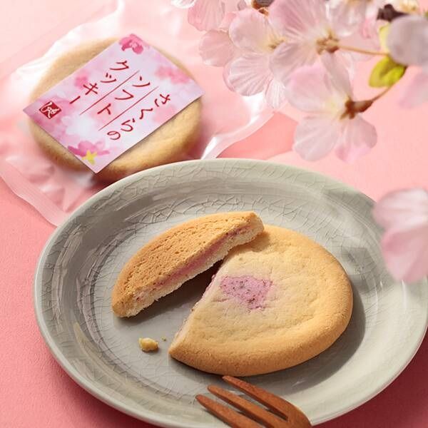 豆乳入りのサクサクビスケットに、桜葉の塩漬け粉末入りのちょっぴりあまじょっぱいクリームをサンドしました。個包装。