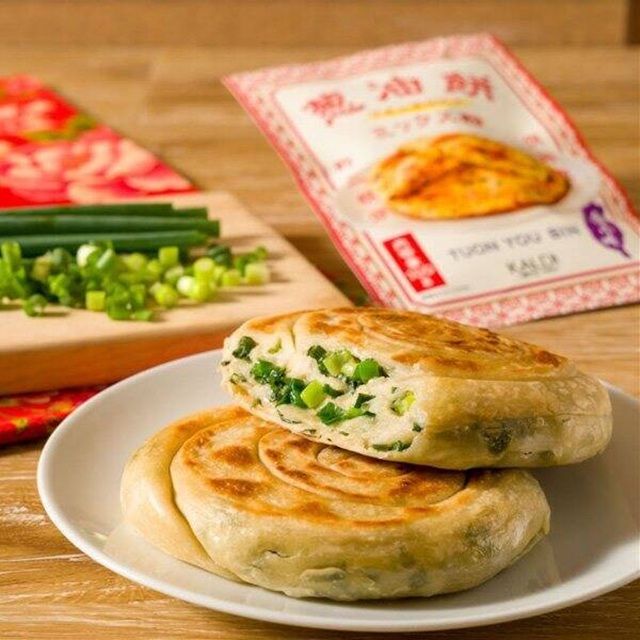 台湾屋台の定番「葱油餅(ツォンヨウビン)」がおうちで作れるミックス粉です。刻んだ葱を巻き込んでフライパンで焼いたパンで、手軽に楽しむ屋台グルメとして親しまれています。