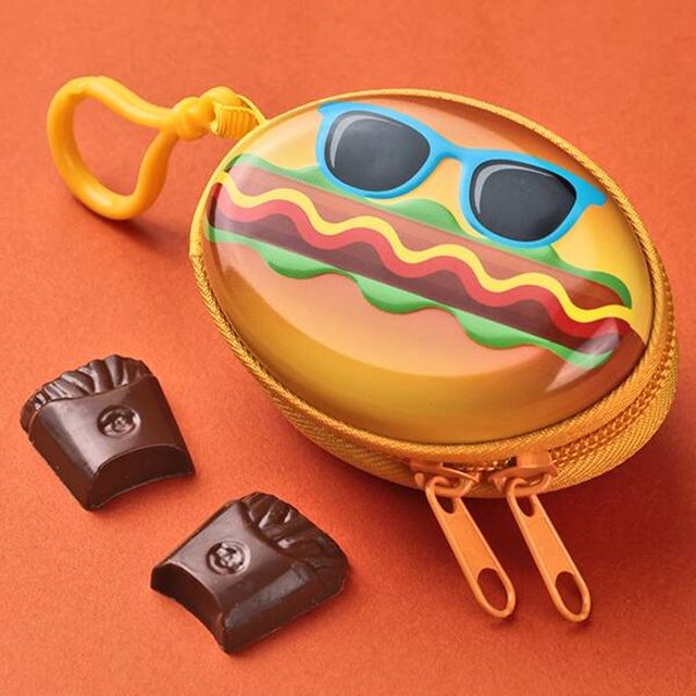 カラビナが付いたハンバーガーとソーセージエッグマフィンのデザイン缶の中に、ハンバーガー柄の包み紙にくるまれたチョコレートが入っています。