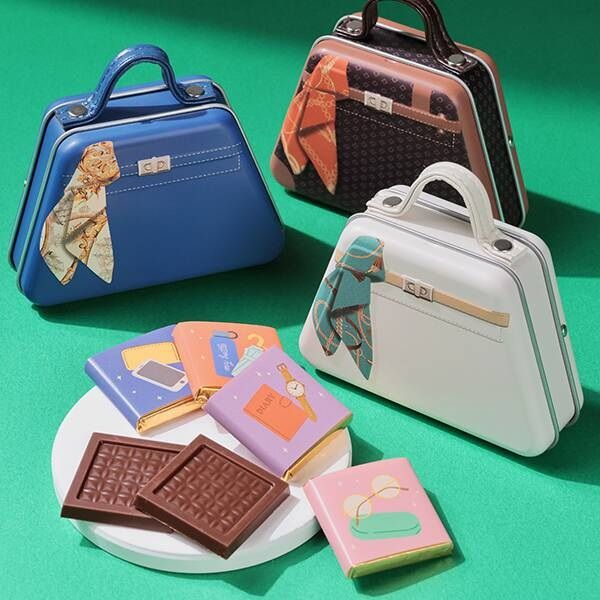 ミニチュアのハンドバッグ缶の中には、小物雑貨がデザインされたナポリタンチョコレートが4枚入っています。缶の色は3種類!