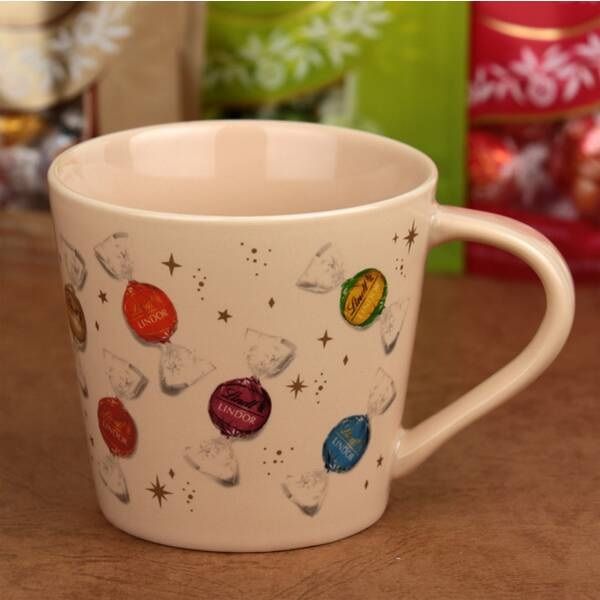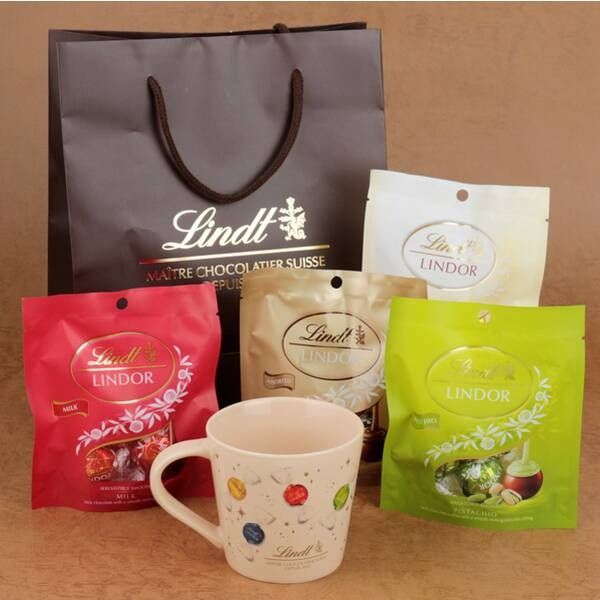 とろけるようなフィリングが魅力のリンドール。ミルク、ホワイト、ピスタチオ、アソート各1袋とオリジナルデザインのマグカップが入ったアソートギフト。