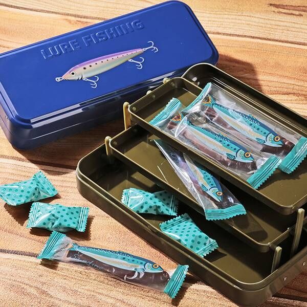 魚釣りに使うルアーのイラストのデザイン缶です。なかに魚型のミルクチョコレートが入っています。缶は3段式のケースになっているので、ルアー以外にもアクセサリーや小物入れにも。
