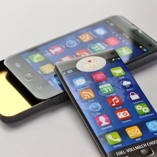 本物そっくりのスマートフォン型ケースに、スマートフォン柄パッケージのミルクチョコレートが1枚入っています。