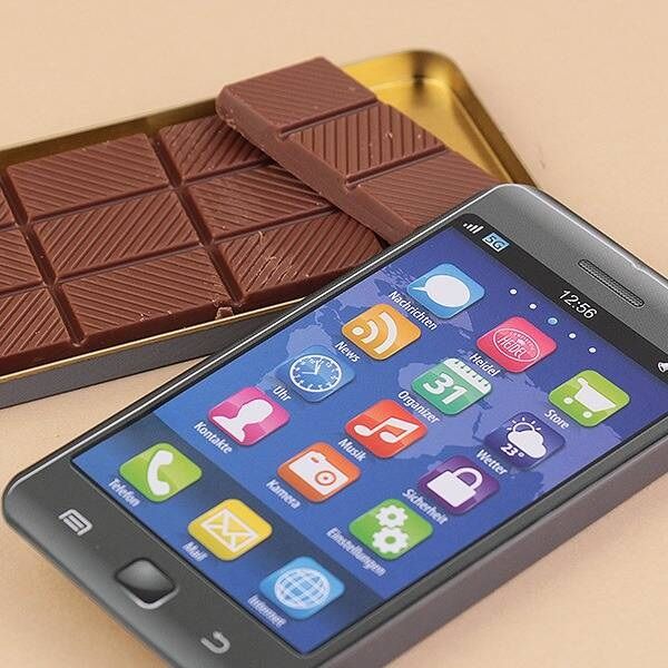 下にスライドして開く。中身はスマホ柄の包装紙のチョコ一枚。ドイツ製らしい。