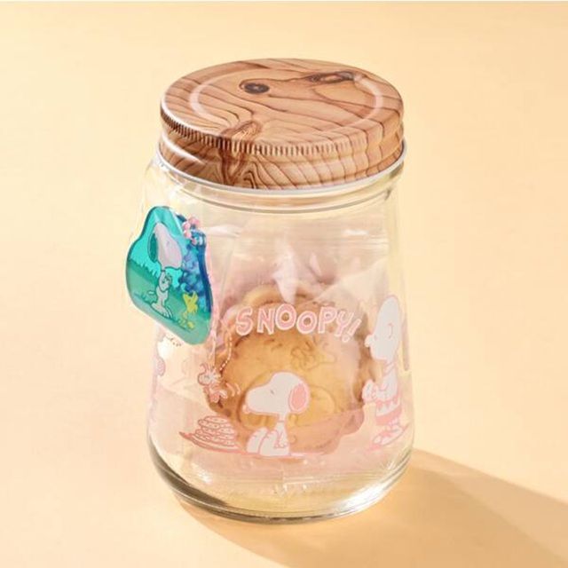 スヌーピープリントのがかわいいグラスジャーです。なかにプレーンとラズベリーフレーバーのクッキーが入っています。