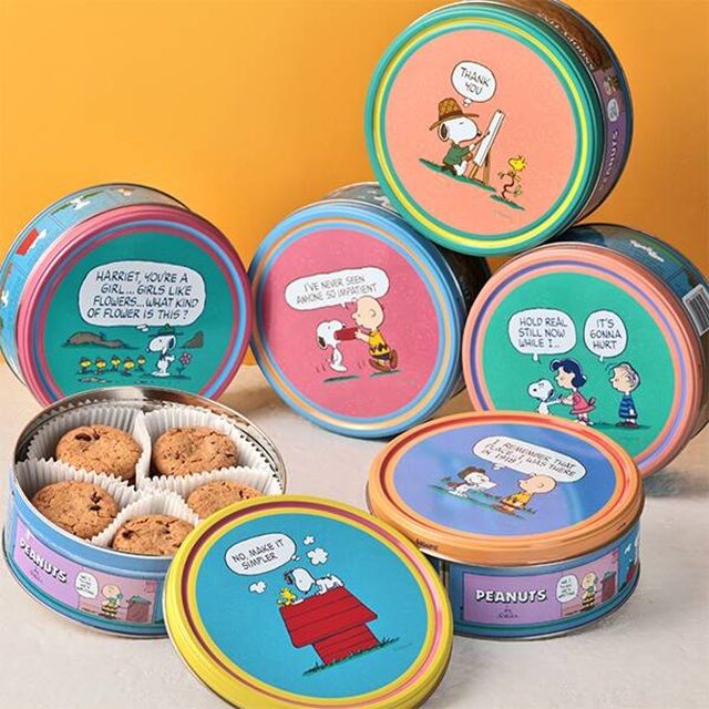 ヌーピーと仲間たちがデザインされたラウンドティンに、チョコチップクッキーが入っています。缶のデザインは6種類!