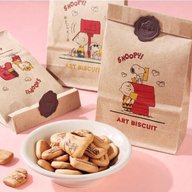 スヌーピー型のワックスシールがかわいいペーパーバッグです。スヌーピー柄のプリントビスケットが入っています。バッグの柄は3種類