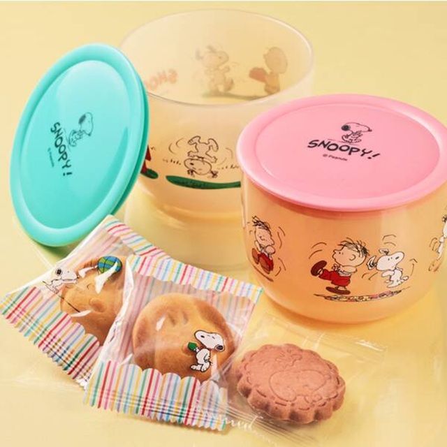 スヌーピーデザインがかわいいクリアコンテナです。なかに焼菓子が入っています。お菓子を食べたあとは小物入れにもどうぞ。コンテナのデザインは2種類