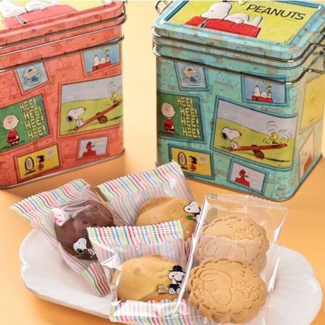スヌーピーが登場するコミック「PEANUTS」の75周年アニバーサリーデザイン缶です。PEANUTの仲間たちの形をしたメープル味とチョコチップ味のクッキーが1袋ずつ入っています。缶のカラーは2種類!